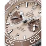 Le cadran est revêtu d'un vernis beige sablé et comporte un guichet de date à 6 heures, des compteurs en céramique nitrure de silicium couleur bronze « azur », ainsi que des mots en décalque bruns et noirs. Le logo OMEGA, les chiffres arabes, les aiguilles et les index sont tous revêtus de PVD gris au fini satiné, tandis que le Super-Luminova blanc améliore la visibilité dans l'obscurité.