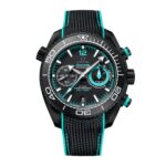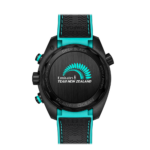 Le cadran en céramique mate fait référence à l’avant course avec un INDICATEUR DE COMPTE À REBOURS à 3 heures, complété par la mention START. L’aiguille et l’anneau de compteur de l’indicateur affichent la couleur turquoise du logo ETNZ, tout comme la minuterie, le chiffre 12 et l’aiguille centrale des secondes du chronographe ornée du trophée de la Coupe de l’America. La couleur se retrouve également sur les anneaux des poussoirs en céramique noire satinée, le HE sur la valve à l’hélium et le logo OMEGA qui orne la couronne.