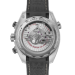 Le cadran présente un traitement galvanisé gris « bronze à canon » sablé et comporte un guichet de date à 6 heures, des compteurs en acier inoxydable sablé ainsi que des mots en décalque beiges et blancs. Le logo OMEGA, les chiffres arabes, les aiguilles et les index sont tous en acier inoxydable revêtu de PVD au fini satiné, tandis que le Super-Luminova beige améliore la visibilité dans l'obscurité.
