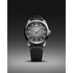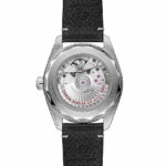 Le boîtier symétrique de 38 mm, poli et satiné, est monté sur un bracelet en cuir noir. Reprenant la lisibilité remarquable de la Railmaster originale, le cadran gris est orné d’un dégradé noir ainsi que de grands chiffres et index revêtus de Super-LumiNova blanc.