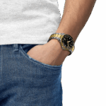 Ce modèle Tissot Seastar 1000 40mm est doté d'une lunette bicolore, noire et recouverte d'un revêtement PVD or jaune sur le pourtour. Le bracelet bicolore en acier inoxydable 316L est également revêtu de PVD or jaune.