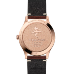Montée sur un bracelet en cuir brun dont la boucle arbore un logo OMEGA vintage, cette montre est entraînée par le calibre à remontage manuel OMEGA Co-Axial Master Chronometer 8927. Ce mouvement est logé derrière un fond de boîtier frappé d’une médaille « BEIJING 2022 » et gravé de plusieurs inscriptions : « NUMBERED EDITION », « CO-AXIAL MASTER CHRONOMETER » et « OT 859 » – une référence historique à l’or rose 18K.