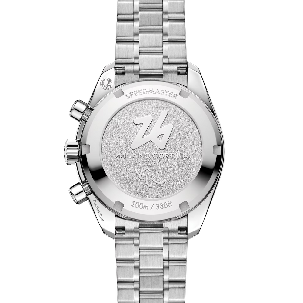 D’autres détails attirent le regard, comme l’aiguille centrale des secondes, avec son dégradé de rouge, bleu et vert, ainsi que la typographie bleu foncé de Milano Cortina qui apparaît dans le guichet de date. Sur le fond de boîte, OMEGA a apposé un médaillon estampillé Milano Cortina 2026.