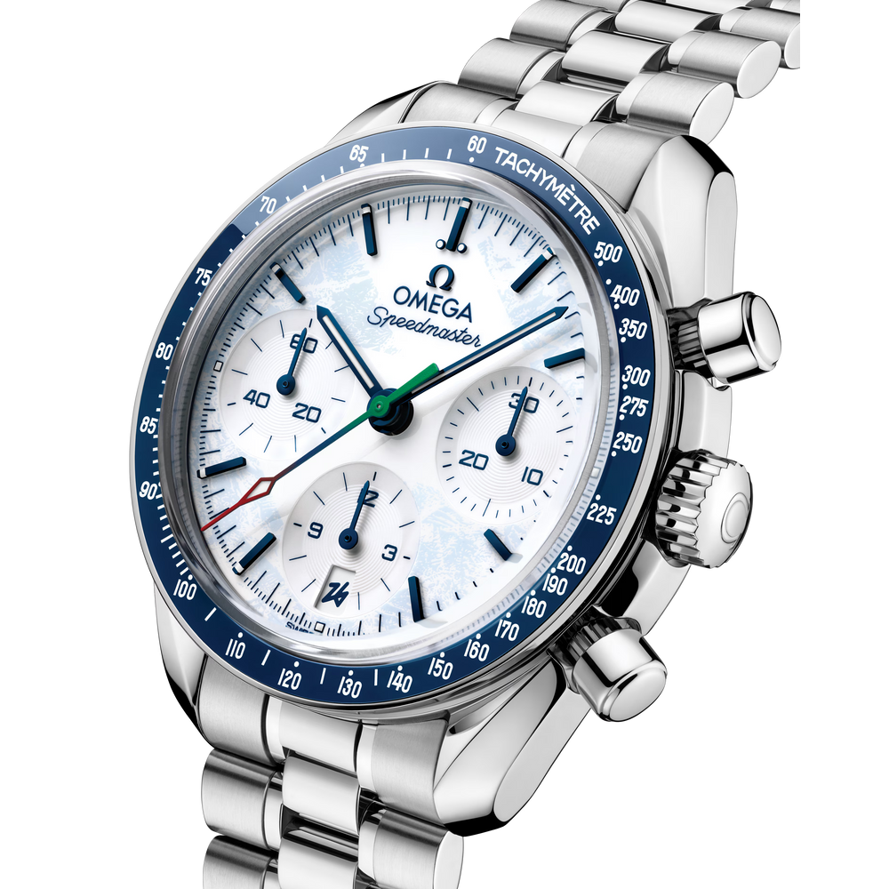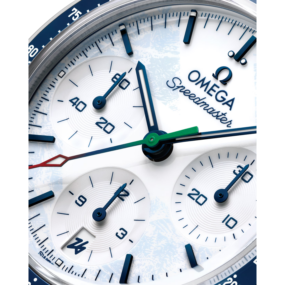 Cette montre de 38 mm en acier inoxydable est dotée d’une lunette en céramique bleue arborant une échelle tachymètre en émail blanc. Pour créer un look hivernal, le cadran verni blanc est orné d’un bleu givré en décalque et d’un motif de traces de doigts inspiré de l’emblème de Milano Cortina 2026. Les compteurs blancs sont également vernis, avec une finition azurée spéciale évoquant une piste de ski damée.