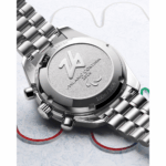 Cette montre de 38 mm en acier inoxydable est dotée d’une lunette en céramique bleue arborant une échelle tachymètre en émail blanc. Pour créer un look hivernal, le cadran verni blanc est orné d’un bleu givré en décalque et d’un motif de traces de doigts inspiré de l’emblème de Milano Cortina 2026. Les compteurs blancs sont également vernis, avec une finition azurée spéciale évoquant une piste de ski damée.