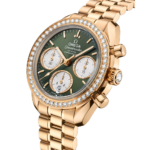 Le cadran vert traité PVD arbore des compteurs ovales horizontaux avec revêtement argenté et un guichet de date ovale vertical à 6 heures. Les aiguilles des heures et des minutes en or Moonshine™ 18K poli au diamant sont revêtues de Super-LumiNova blanc à lueur verte.