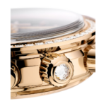 Ce modèle arbore un boîtier en or Moonshine™ 18K entièrement poli, une lunette sertie de 52 diamants et une couronne polie surmontée d'un unique diamant.