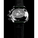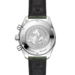 La montre repose sur un bracelet en cuir vert fermé par une boucle déployante en acier inoxydable. Son fond de boîtier vissé est estampé d’un médaillon Hippocampe. La montre est animée par le calibre OMEGA Co-Axial 3330.