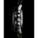 Le cadran vert traité PVD arbore des compteurs ovales horizontaux avec revêtement argenté et un guichet de date ovale vertical à 6 heures. Les aiguilles des heures et des minutes rhodiées polies au diamant sont revêtues de Super-LumiNova blanc à lueur verte.