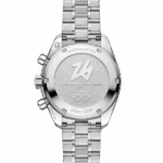 D’autres détails attirent le regard, comme l’aiguille centrale des secondes, avec son dégradé de bleu, ou encore la typographie de Milano Cortina bleu foncé qui apparaît dans le guichet de date. Sur le fond de boîte, OMEGA a apposé un médaillon estampillé Milano Cortina 2026.
