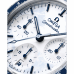 Cette montre de 38 mm en acier inoxydable est dotée d’une lunette en céramique bleue arborant une échelle tachymètre en émail blanc. Pour créer un look hivernal, le cadran verni blanc est orné d’un bleu givré en décalque et d’un motif de traces de doigts inspiré de l’emblème de Milano Cortina 2026. Les compteurs blancs sont également vernis, avec une finition azurée spéciale évoquant une piste de ski damée.