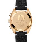 Au dos, le fond de boîtier commémoratif en or Moonshine™ 18K révèle un médaillon avec une base givrée, estampillée du logo Paris 2024 poli effet miroir avec l’inscription « Paris 2024 » et les anneaux olympiques.