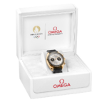 Ce modèle de 43 mm rend hommage aux Jeux Olympiques de Paris 2024 et arbore les trois couleurs principales de l’événement, à savoir l’or, le noir et le blanc. Cette montre est confectionnée en or Moonshine™ 18K avec un cadran opalin blanc argenté et des compteurs noircis. Elle se caractérise également par une lunette en céramique noire avec échelle tachymétrique en Ceragold™ OMEGA, des chiffres arabes en or Moonshine™ 18K, des aiguilles feuilles et des aiguilles des compteurs avec revêtement PVD or Moonshine™.