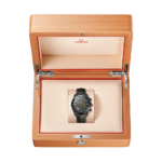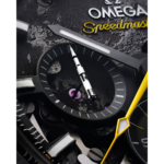 Dans ce modèle de 44,25 mm, l'histoire de la Speedmaster à bord de la mission Apollo 8 est célébrée par le mouvement noirci, dont la platine et les ponts sont gravés au laser pour représenter la surface de la Lune. La face visible apparaît à travers le cadran squeletté en aluminium anodisé noir, tandis que la face cachée se découvre sur le fond du boîtier.