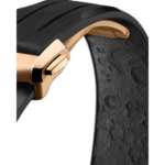 Inspirée de la Speedmaster 4e génération, cette Moonwatch de 42 mm en or Moonshine™ 18K arbore un cadran à étage soleillé en or Moonshine™ 18K et des compteurs et index noircis. Sa lunette en céramique noire, dotée d’une échelle tachymétrique en Ceragold™ OMEGA, est frappée du point signature au-dessus du chiffre 90. En hommage à son histoire, le dessous du bracelet en caoutchouc noir arbore un motif de la surface de la Lune en relief.
