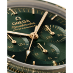 Inspirée de la Speedmaster 4e génération, cette Moonwatch de 42 mm, dont le boîtier et le bracelet sont en or Moonshine™ 18K, arbore un cadran à étage soleillé en PVD vert et des aiguilles de style « Moonwatch ». Sa lunette en céramique verte, dotée d’une échelle tachymétrique en Ceragold™ OMEGA, est frappée du point signature au-dessus du chiffre 90.