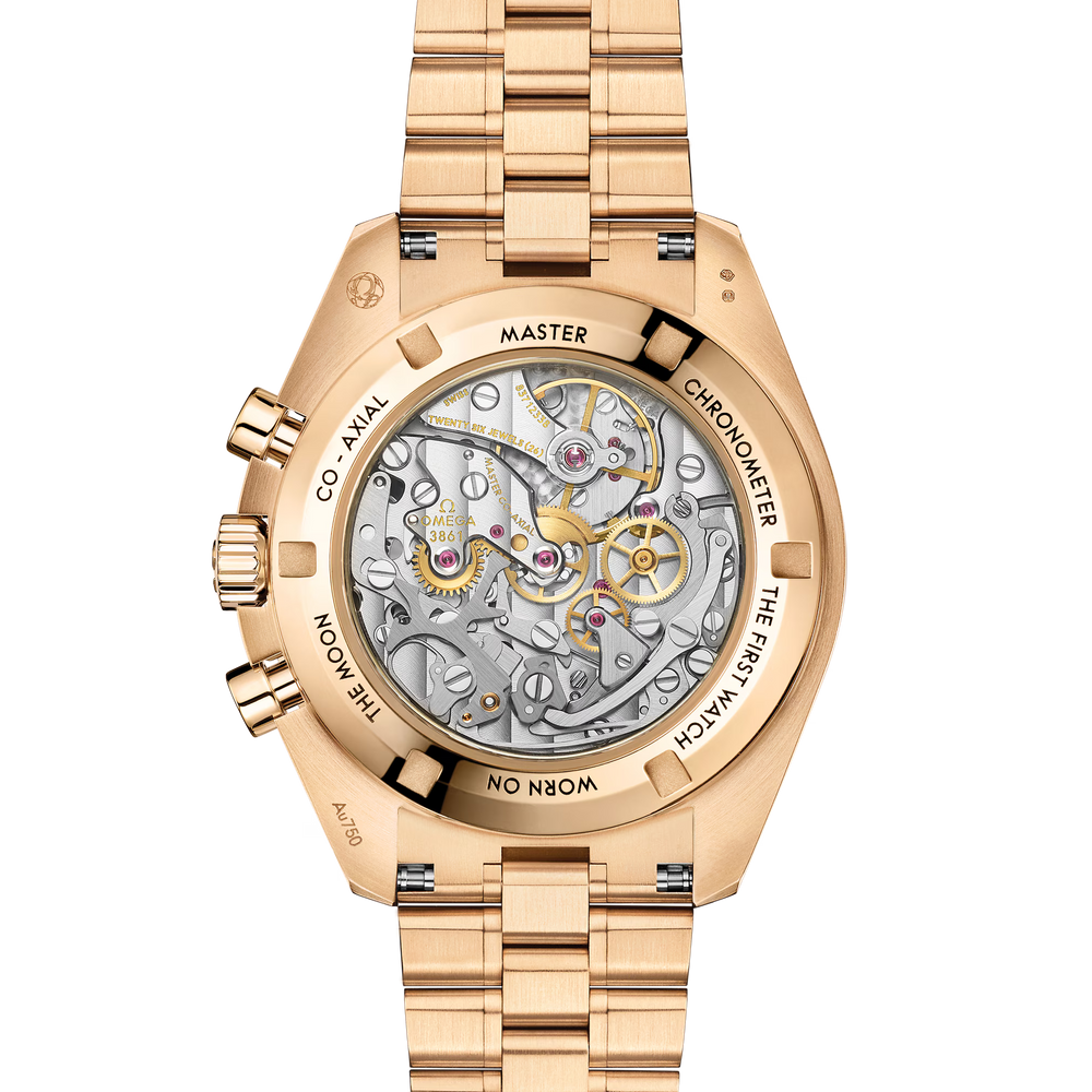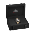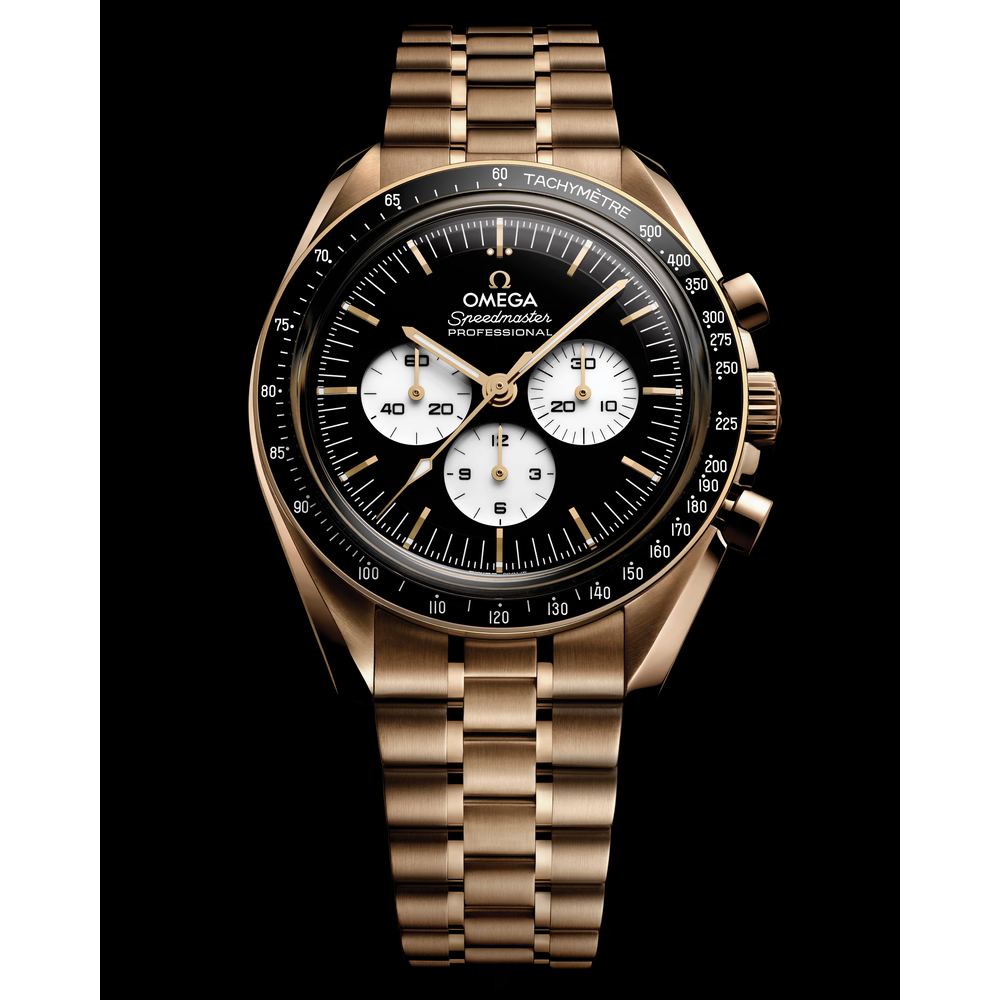 Ce modèle en or Moonshine™ 18K de 42 mm présente un verre saphir sur l’avant et le fond de boîte et arbore un bracelet poli et satiné réalisé dans le même métal précieux. Son design s’inspire de la Speedmaster de 4e génération portée sur la Lune. Le cadran à étage et à double plaque, noir verni et laqué, est complété par des compteurs blancs vernis et laqués, enchâssés dans des cadres rhodiés. La montre est également ornée du logo, des index et des aiguilles OMEGA en or Moonshine™ 18K, et du célèbre point signature au-dessus du chiffre 90 sur la lunette en céramique noire.