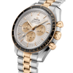 Ce modèle bicolore de 42 mm en acier inoxydable et en or Moonshine™ 18K présente un verre saphir sur l’avant comme sur le fond du boîtier. Inspirée de la Speedmaster 4e génération portée sur la Lune, cette montre est dotée d'un boîtier asymétrique avec lunette en céramique noire, et d’une échelle tachymétrique qui affiche le célèbre point au-dessus du chiffre 90 en Ceragold™ OMEGA.