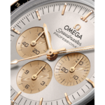 Le cadran à degrés soleillé argenté est orné du logo OMEGA et d'index appliqués, d'aiguilles en or Moonshine™ 18K et de compteurs en or Moonshine™ 18K galvanisés, dont un compteur de petite seconde, un compteur des 30 minutes et un compteur des 12 heures.