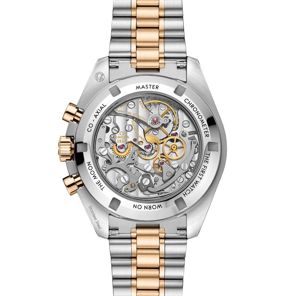 Ce modèle bicolore de 42 mm en acier inoxydable et en or Moonshine™ 18K présente un verre saphir sur l’avant comme sur le fond du boîtier. Inspirée de la Speedmaster 4e génération portée sur la Lune, cette montre est dotée d'un boîtier asymétrique avec lunette en céramique noire, et d’une échelle tachymétrique qui affiche le célèbre point au-dessus du chiffre 90 en Ceragold™ OMEGA.