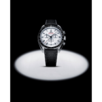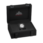 Cette Moonwatch de 42 mm en acier inoxydable est montée sur un bracelet en cuir noir micro-perforé avec des surpiqûres blanches et rouges. Elle présente un verre saphir sur l’avant comme sur le fond de boîtier. Inspirée de la Speedmaster 4e génération portée sur la Lune, cette montre au boîtier asymétrique arbore un cadran à étage laqué blanc, rehaussé du logo OMEGA et d’index appliqués, ainsi que des aiguilles style « Moonwatch ». La lunette noire en aluminium anodisé est quant à elle frappée du point signature au-dessus du chiffre 90.