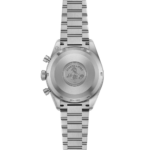 La montre en acier inoxydable satiné de 40,85 mm arbore un cadran noir à finition mate grainée avec un anneau extérieur rhodié et des index constitués de blocs de Super-LumiNova blanc à luminescence verte.