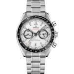 Sur le cadran blanc, la minuterie décorée d'un motif à carreaux symbolise le lien qui unit cette montre aux sports automobiles. Celle-ci comporte également deux compteurs cerclés d’anneaux noircis ainsi qu'un guichet de date à 6 heures assorti aux couleurs du cadran. Les aiguilles des heures et des minutes ainsi que les index sont noircis et revêtus de Super-LumiNova blanc. La mention « Speedmaster » orange est assortie à la pointe de l’aiguille centrale des secondes.