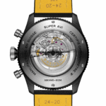 L’ensemble du boîtier en céramique noire contraste de façon saisissante avec les poussoirs, la couronne, le fond du boîtier et la boucle en titane. La lunette moletée assure une prise en main optimale, même avec les mains gantées d’un pilote. Le bracelet en cuir militaire fait un clin d’œil à l’équipement de vol classique. Les pilotes et autres voyageurs apprécieront la possibilité de lire un second fuseau horaire grâce à l’aiguille GMT à pointe blanche, ainsi qu’à la graduation de 24 heures figurant sur le réhaut. La Super AVI est alimentée par un mouvement Calibre manufacture Breitling B04 certifié COSC, qui garantit une réserve de marche d’environ 70 heures.