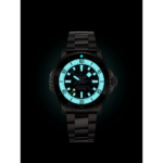 Et elle possède d’autres caractéristiques particulières : son boîtier interne en fer doux assure une protection contre les effets des champs magnétiques, tandis que sa lunette tournante bidirectionnelle peut être bloquée par un verrou situé du côté gauche du boîtier.