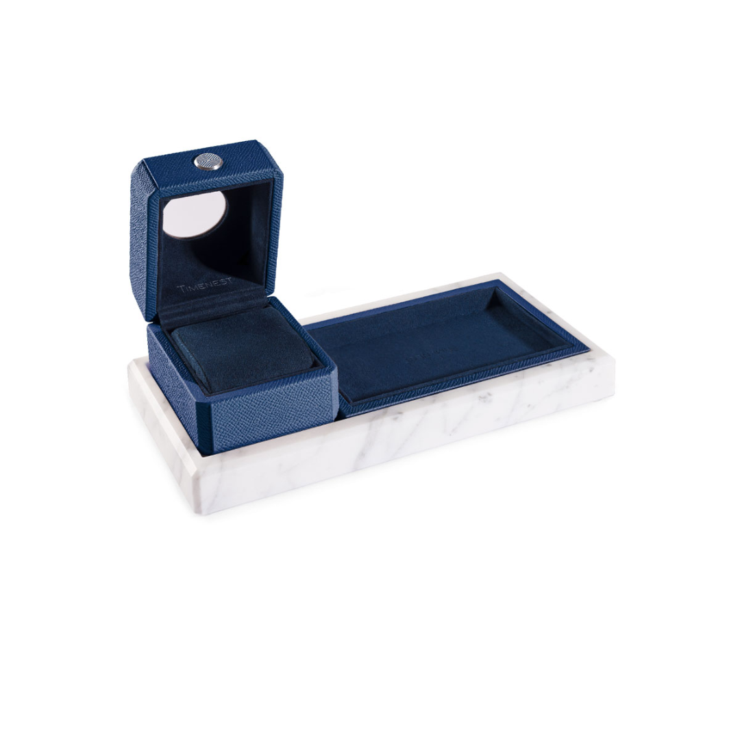 Timenest, coffret de montre, un écrin de montre en cuir de veau bleu, un vide poche en marbre gris et cuir de veau bleu