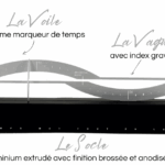 “La Vague” et son marqueur de temps “La Voile” sont en aluminium naturel brossé.