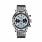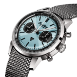 Créée en collaboration avec la marque britannique de motos à la longue tradition Triumph, cette montre se distingue avant tout par son cadran bleu glacier. Cette nuance particulière a été spécialement assortie à la Triumph Thunderbird 6T bleue de 1951 et à la Breitling Top Time Réf. 815 avec son cadran bleu, modèle rare lancé dans les années 1970.