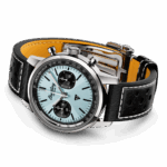 Créée en collaboration avec la marque britannique de motos à la longue tradition Triumph, cette montre se distingue avant tout par son cadran bleu glacier. Cette nuance particulière a été spécialement assortie à la Triumph Thunderbird 6T bleue de 1951 et à la Breitling Top Time Réf. 815 avec son cadran bleu, modèle rare lancé dans les années 1970.