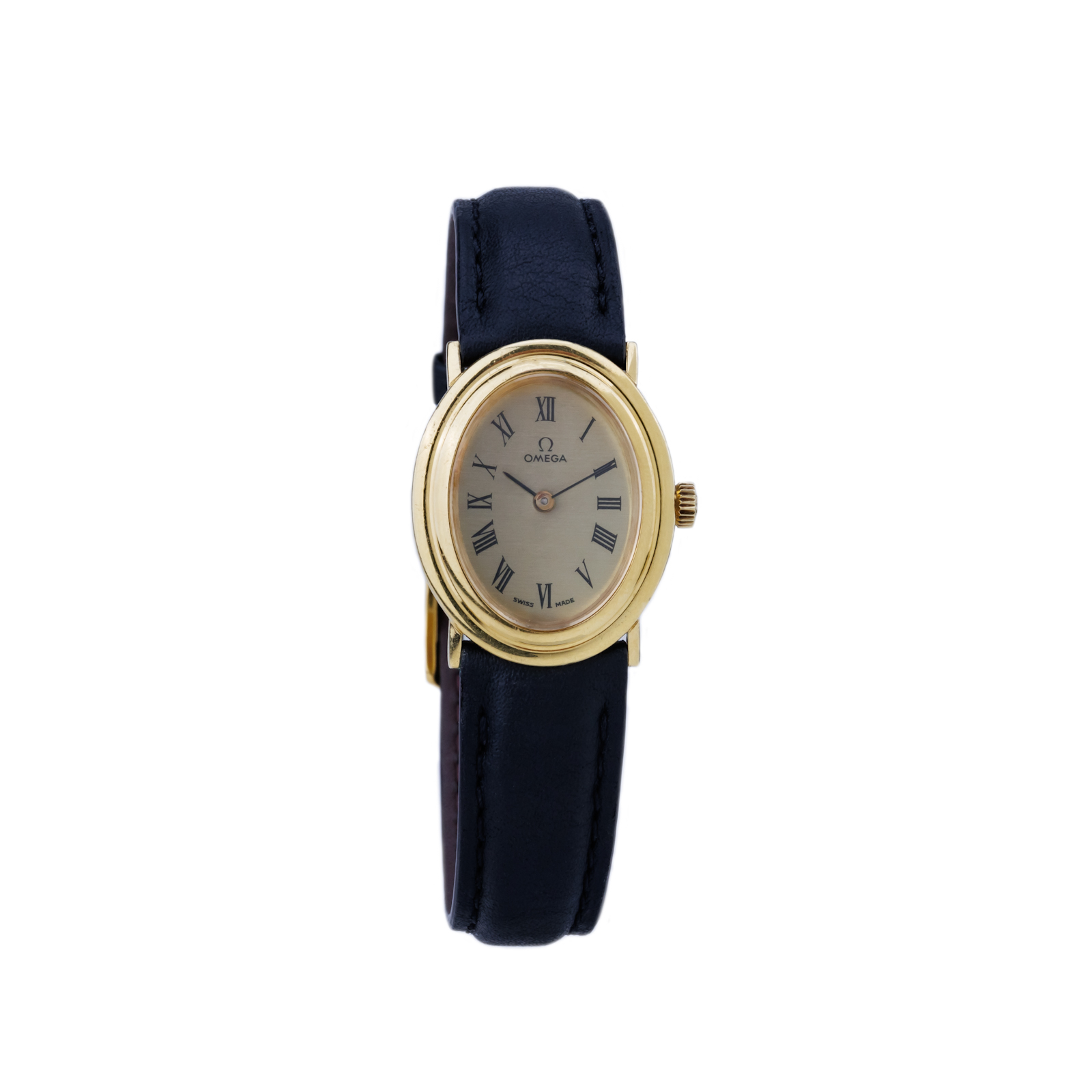 Occasion, Vintage, Omega forme baignoire, mouvement mécanique à remontage manuel, calibre 625, boîte ovale or jaune 750, 21x27 mm, cadran doré, chiffres romains, verre minéral, étanche à la poussière, bracelet cuir noir, boucle ardillon dorée pas d'origine.